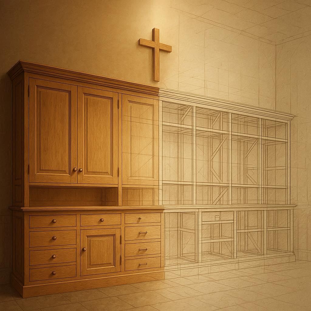 Możesz również pomóc w umeblowaniu zakrystii. Każda półka to symbol Twojego udziału w trosce o piękno i porządek w Domu Bożym.